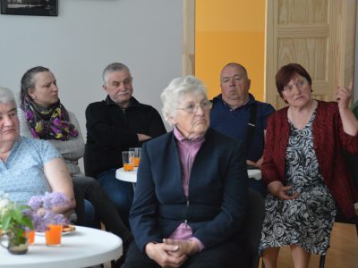 4. Cilvēku grupa, galvenokārt gados vecāki cilvēki, sēž iekštelpās, klausoties vai vērojot priekšā notiekošo. Priekšplānā redzamas trīs gados vecākas sievietes: viena ar baltiem matiem sarkanā jakā, otra ar brūniem matiem brūnā vestē, trešā ar sirmiem matiem violetā jakā.