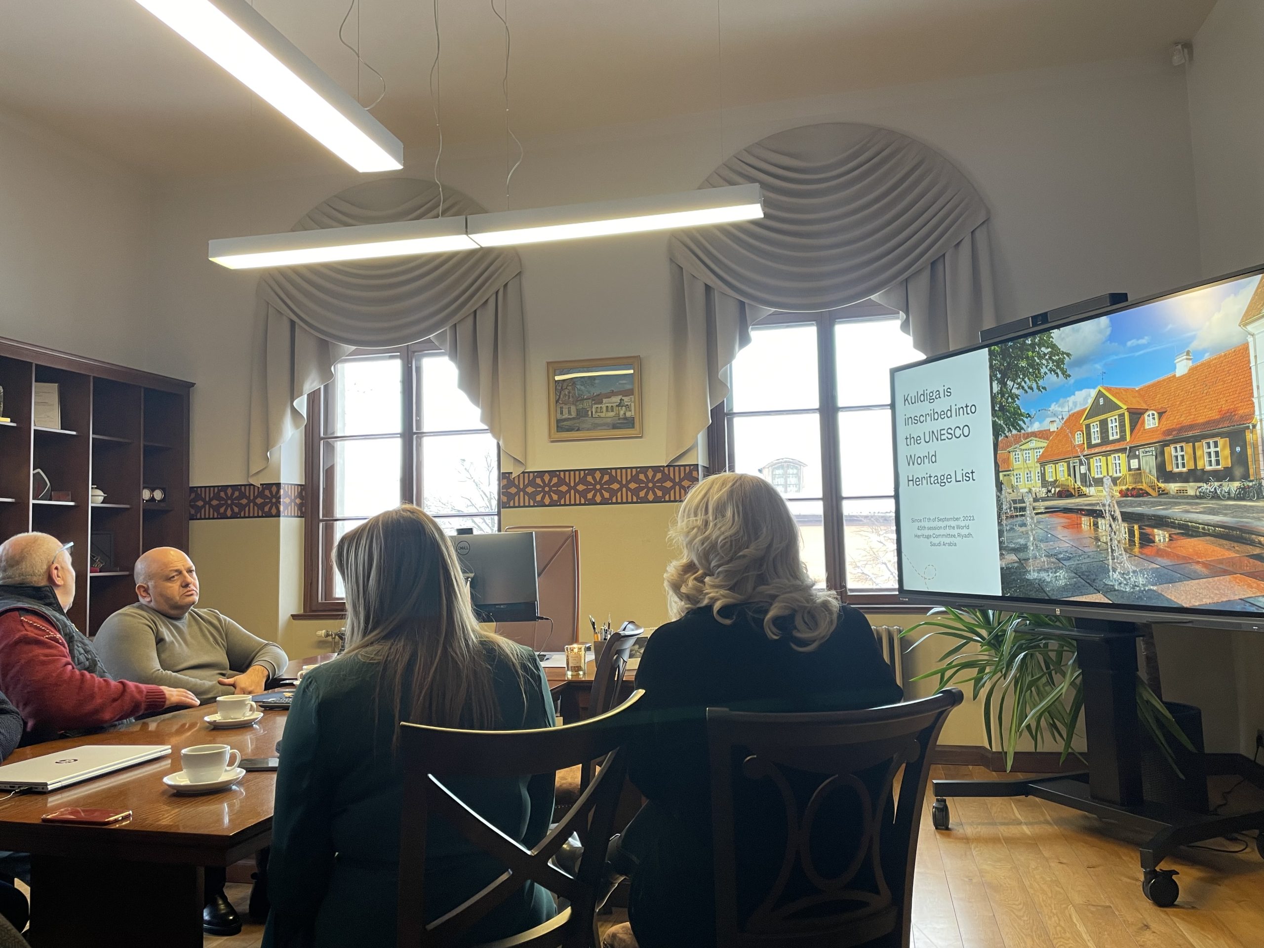 Kolēģus silti uzņēma Kuldīgas novada domes vadība – priekšsēdētāja Inese Astaševska, priekšsēdētājas vietnieks Artis Roberts, Kultūras nodaļas vadītāja Dace Reinkopa, kā arī vecpilsētas pārvaldības speciāliste Sintija Vītoliņa. Kuldīgas novada pašvaldības vadība iepazīstināja ar novada attīstības projektiem, tūrisma un uzņēmējdarbības rādītājiem, kā arī vecpilsētas pārvaldības plānu, kā arī ceļu līdz UNESCO Pasaules mantojuma statusam.