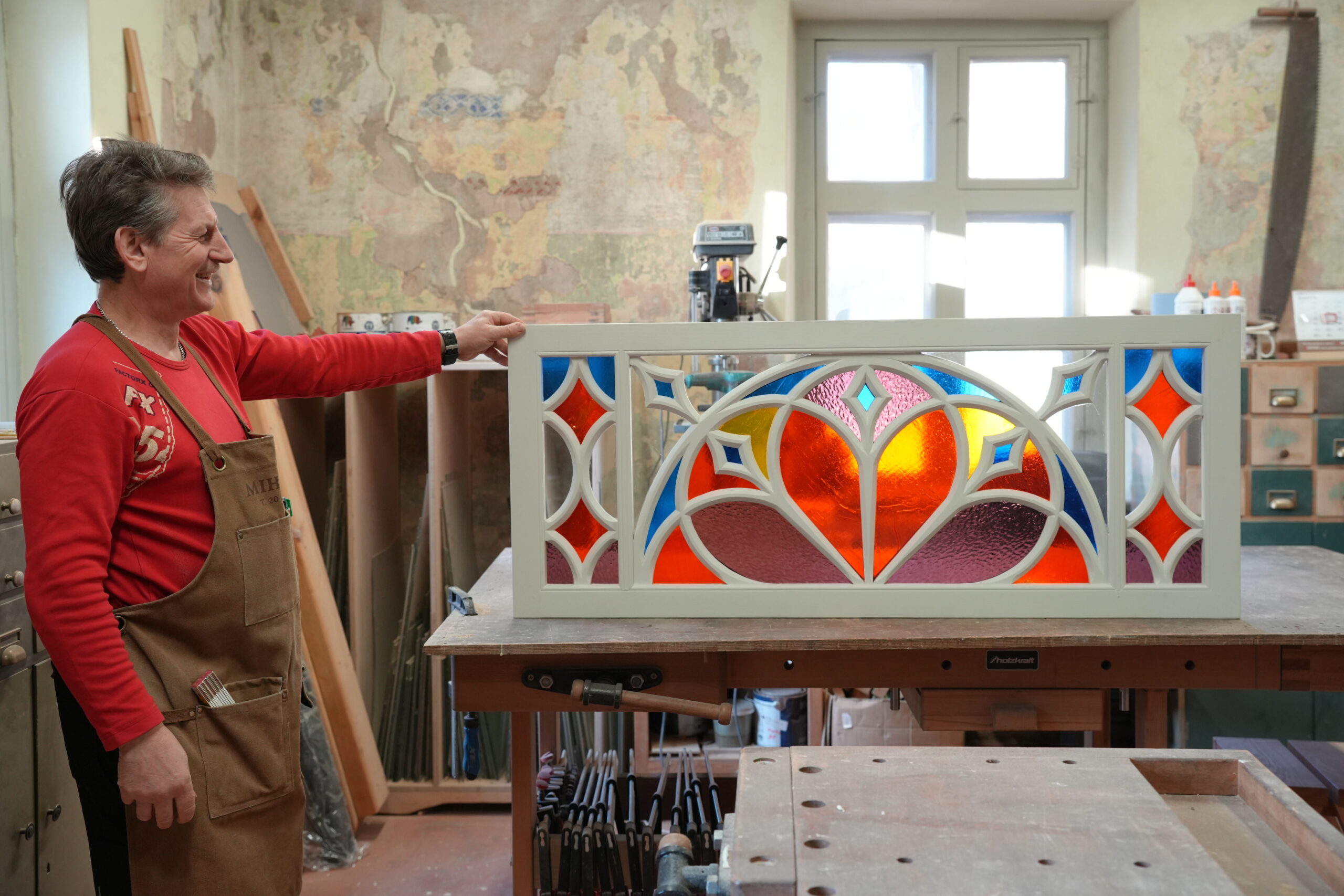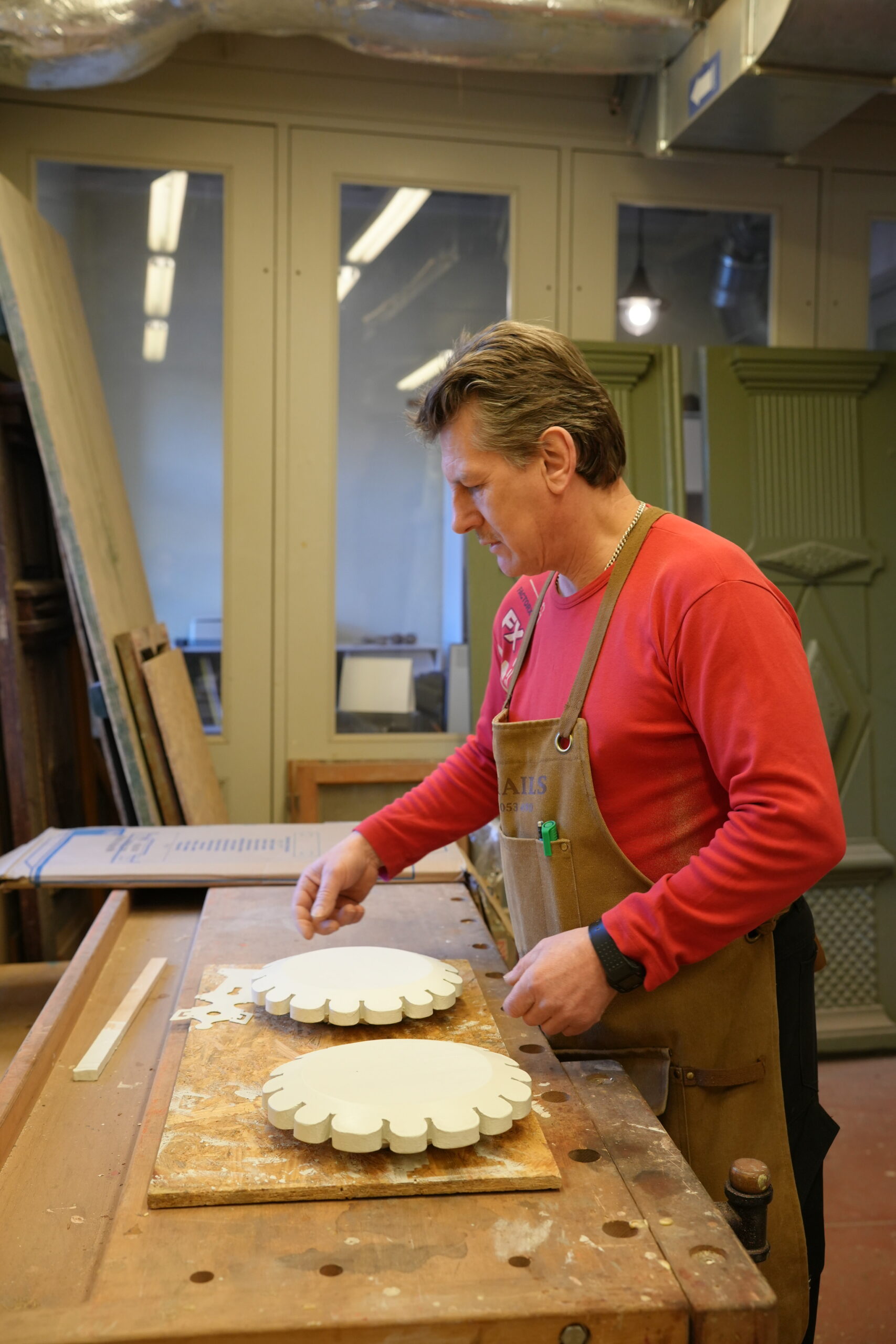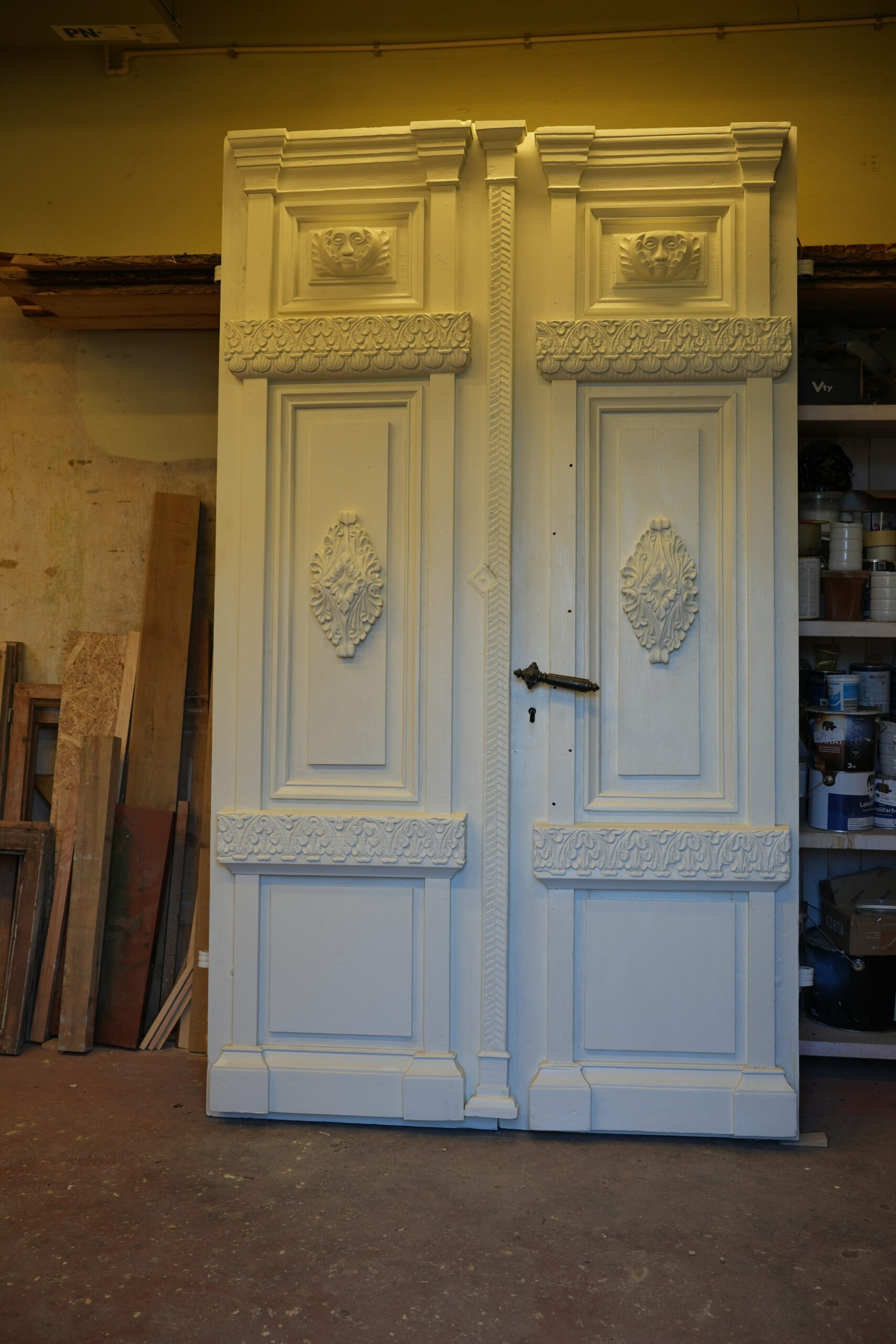 Darba gaitā meistars rūpīgi atsedza nenoturīgos krāsu slāņus. Tā kā oriģinālais krāsojums laika gaitā bija pilnībā zudis, sadarbībā ar arhitektiem durvīm tika izvēlēts atbilstošs tonis, kas tagad iekļaujas ēkas jaunajā krāsu pasē. Restaurācijā izmantoti tradicionāli materiāli – lineļļa, lineļļas krāsa un ķite –, tādējādi saglabājot koksnes vēsturisko patinu un raksturu.