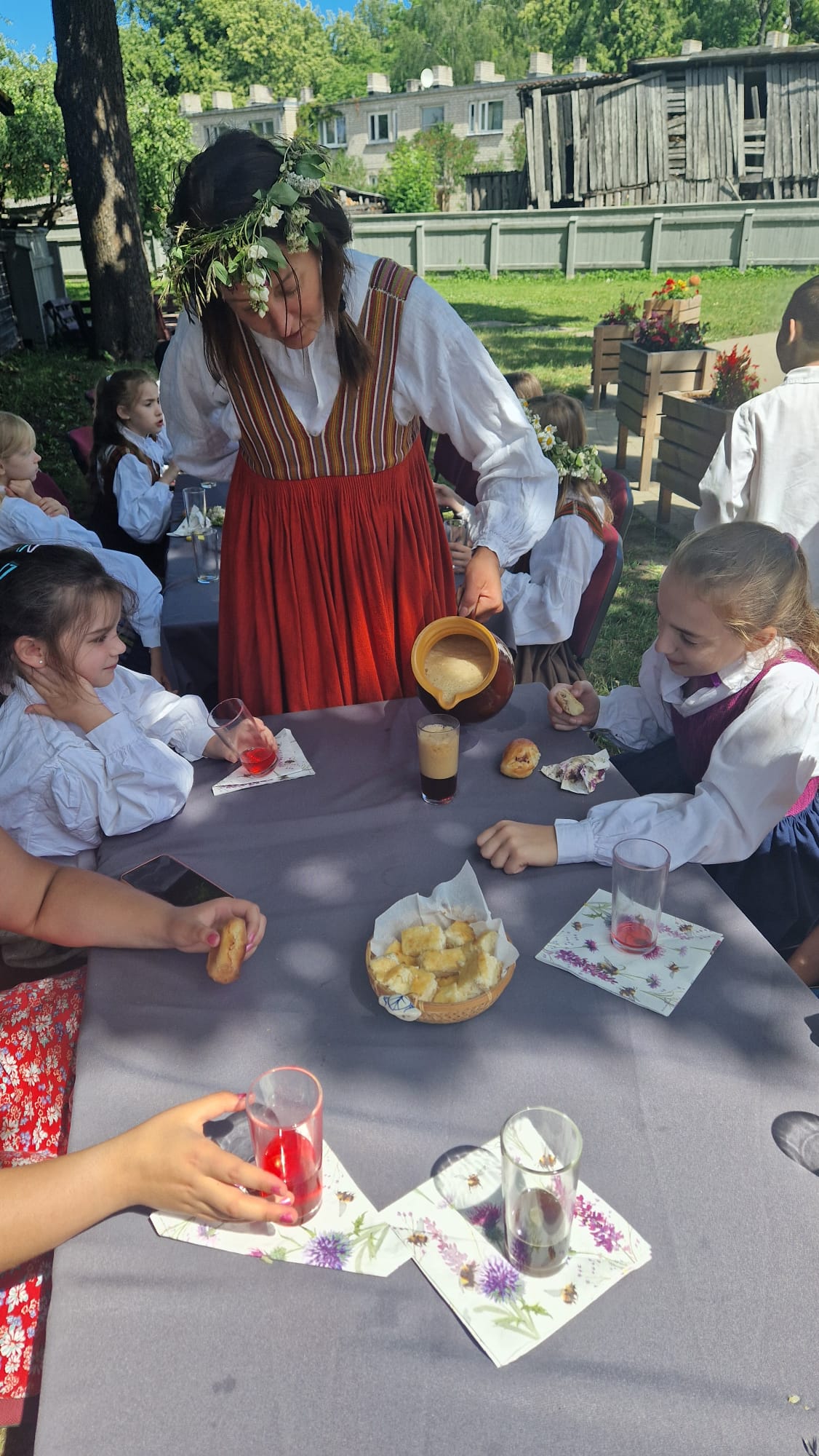 Radošo nodarbību noslēgumā Ikvienam, kurš vēlējās, bija iespēja uzvilkt latviešu tautastērpu, kā arī pīt ziedu vainagus. Tāpat bērni tika sēdināti pie svinīgi klāta galda, pie kura varēja cienāties ar Jāņu sieru, pīrāgiem, raušiem un kvasu.